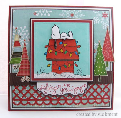 We also have the talented Sue Kment with us as a Guest Designer today. Thank you Sue for playing along with us for this challenge. You can find more of Sue's fun and amazing creations on her blog Sue's Stamping Stuff. Here is Sue's totally cute Snoopy creation for this week:
