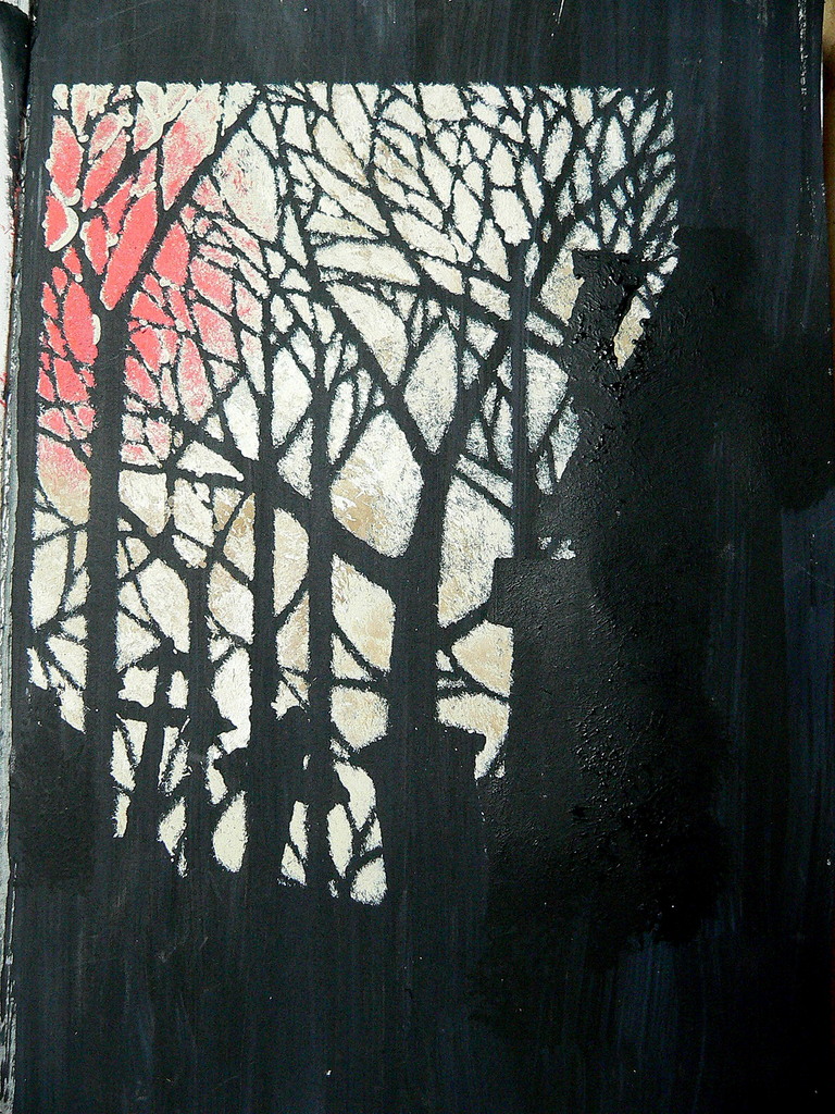 I chose to make a canvas art based in the Nordic / Scandinavian light. Particularly light in winter. As you all now it is very cold in Norway, special in wintertime. Those little men and that little boat you can see in the light areas is rubberstamp made out of drawings of original rock carvings in Scandinavia that dates some 3000 years back. Isn’t that cool?