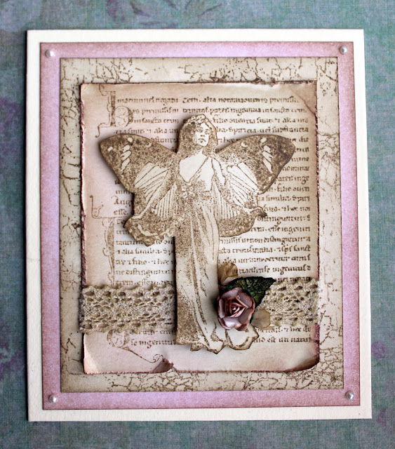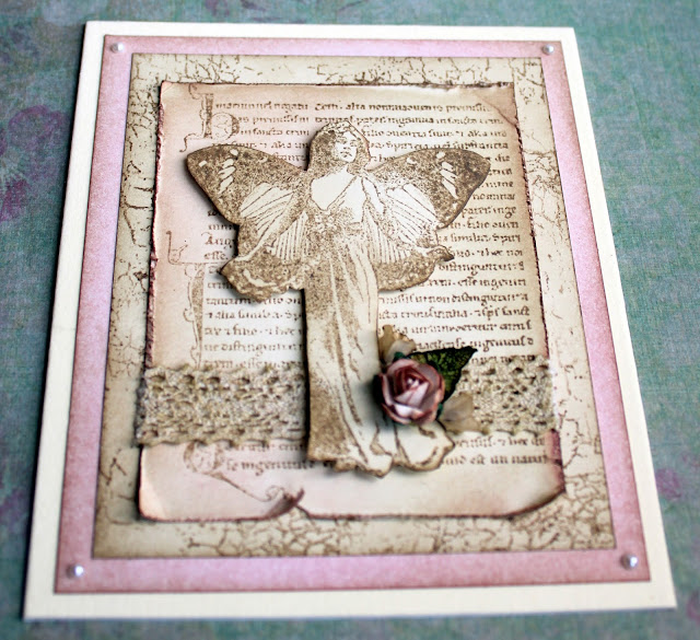 I roughed up the edges of the Manuscript card and tore parts to give it an aged distressed look. I added some smudges of Victorian Velvet DI to complement the pink tones I intended to add.