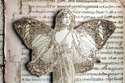 My focal image is from the Tim Holtz Winged Things stamp set.  The little fairy is colored using Distress Inks and Crayons.